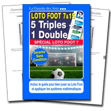 Un système simple et efficace qui vous permet de jouer 5 Triples et 1 Double ensemble. Un procédé sans aucune condition qui vous donnera un minimum de 5 matchs justes sur les 6 si votre Double est exact. Un jeu idéal pour le Loto Foot 7, car vous n'avez qu'un seul match de base (match fixe) à trouver pour compléter votre grille. Néanmoins, il peut bien sûr fonctionner avec toutes les formules Loto Foot : Loto Foot 8, Loto Foot 12 ou Loto Foot 15.