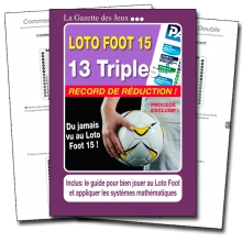 Une astuce mathématique vous dévoile comment jouer enfin 13 Triples au Loto Foot. Une simple condition a permis de supprimer 99,99% des combinaisons de la formule intégrale. Il ne reste plus que 156 grilles unitaires à jouer. Afin de simplifier l'application de ce systèmes, le jeu est composé de 36 grilles multiples seulement. C'est très fort et très pratique.